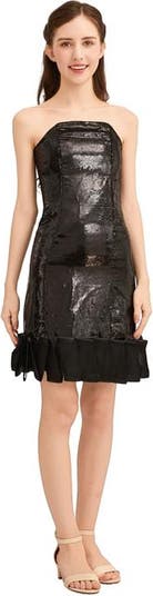 This elegant piece features a sleek satin bodice with a fitted silhouette that flows into a flared skirt. The hemline is finished with a playful matte ruffled trim, creating a striking contrast of textures and adding volume for a dramatic evening look.