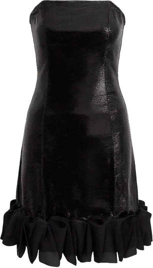 This elegant piece features a sleek satin bodice with a fitted silhouette that flows into a flared skirt. The hemline is finished with a playful matte ruffled trim, creating a striking contrast of textures and adding volume for a dramatic evening look.