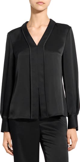 Front binding adds texture and dimension to this fluid V-neck top cut from glossy skin-skimming satin.