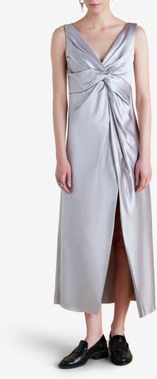 This stunning dress in pale grey satin features a gestrual hand-twist along the V-neckline, embracing a strong sense of modern femininity. Our signature satin is crafted with the right amount of sheen to elevate your look for all occasions.