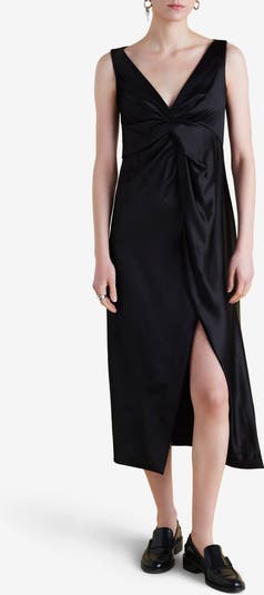 This stunning satin dress features a gestrual hand-twist along the V-neckline, embracing a strong sense of modern femininity. Our signature satin is crafted with the right amount of sheen to elevate your look for all occasions.