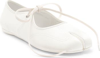 Split-toe detailing and wraparound laces bring a contemporary look to this Mary Jane flat designed for flexible, close-to-the-foot wear.