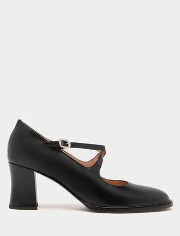 The Saule Mary-Jane pump brings modern edge to a classic silhouette. A round toe and crisscross straps define the upper in black brushed leather, which also covers the block spool heel.