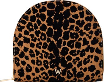 - Removable zip pouch Interior zip pocket 4 x necklace holders 2 x ring holders 39 stud holders Gold finish hardware Recycled nubuck-finish PU with flocked leopard print LusterLoc™ lining