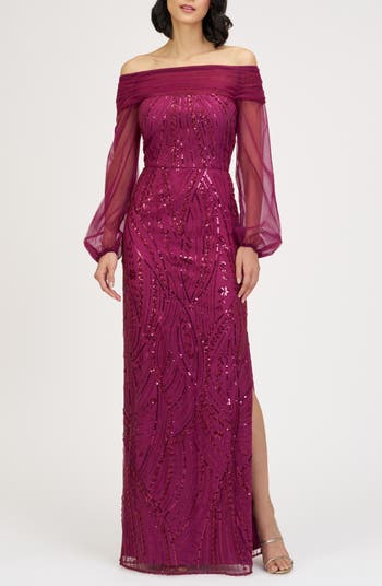 Embellished chiffon lends an air of whimsy to this balloon-sleeve column gown that falls delicately off the shoulder, making it a stunning option for your next event.