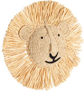 - A majestic lion head wall décor, meticulously crafted from paper rope and dried raffia, in a natural and black palette that captures the essence of the wild