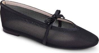 A V-cut topline and bow-accented mary jane strap highlight the airy mesh upper of a streamlined ballet flat featuring a plain toe for versatile styling.