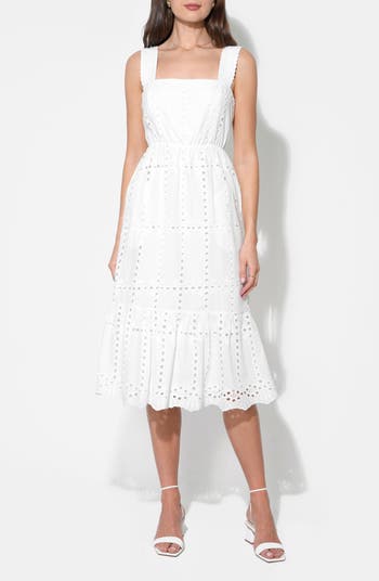 Breeze through sunny days and vacay plans in this airy eyelet midi dress cut from crisp, fresh cotton. Scalloped straps with floral embroidery sweeten the look, while a shirred back panel adds flexible comfort as you move through your day.