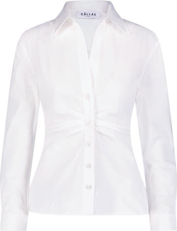 The Savil is a button front shirt in a crisp, cotton poplin. It features an open neckline, spread point collar, long sleeves with button cuffs, and a chest pocket. The Savil is tailored with tucks down the front for a contoured waist and flattering silhouette. Available in White and Navy. More Details 69% Cotton, 25% Poliamide, 6% Elastan Professional dry cleaning recommended Size Italian 40: Length 60 cm/23.5", Sleeve 82 cm, 32.5" Model is 5' 10" (177 cm) and is wearing a size 40.