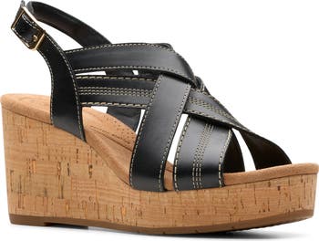 Contrast stitching details the supple leather straps of a breezy sandal designed with a cushy footbed and a cork-wrapped platform wedge.