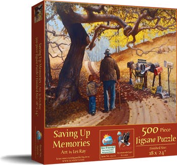 Immerse yourself in a world of nostalgia with the "Saving Up Memories" 500 piece jigsaw puzzle by revered artist Les Ray, miss no valuable moment of warmth and connection as you assemble this captivating 18" x 24" scene. SunsOut, known for their high-quality craftsmanship, brings you this puzzle made from durable, recycled cardboard, expertly crafted with precision interlocking pieces for a perfect fit and countless enjoyable hours. Proudly made in the USA, SunsOut puzzles are eco-friendly, using soy-based inks and top-quality recycled board, demonstrating our dedication to sustainable practices and environmental stewardship. We are a woman-owned small business, and it's important to us that you have a guilt-free puzzling experience, knowing you're supporting responsible manufacturing. Our worry-free guarantee provides you with peace of mind - if you stumble upon any issues, we're here to resolve them attentively, ensuring your satisfaction remains paramount and allowing you to get lost in the joy of puzzle-solving. The "Saving Up Memories" puzzle also makes a heartfelt gift for any occasion; whether it's a holiday, birthday, or simply an urge to reconnect with nature, it's an ideal present for those who appreciate life's simple pleasures and cherish a thoughtful pastime. This puzzle is sure to bring joy to every puzzler's heart.