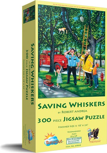 Unleash your creativity with the Saving Whiskers 300 piece jigsaw puzzle by Robert Andrea. This captivating puzzle provides hours of entertainment and relaxation as you assemble a vivid and heartfelt rescue mission one piece at a time. Measuring 18" x 24" when completed, each interlocking piece fits with precision, reflecting SunsOut's commitment to durable construction with premium recycled cardboard. Made in the USA, these puzzles maintain the highest manufacturing standards, showcasing fully licensed artwork in vibrant colors and exceptional detail. Sustainability is further championed through the use of eco-friendly soy-based inks and high-quality recycled-board. SunsOut, a proudly woman-owned small business, produces puzzles that resonate with quality and charm, offering a worry-free guarantee that resolves any issues with missing or damaged pieces, epitomizing their dedication to service excellence. So, let yourself embark on this memorable journey of art and storytelling, assembling the Saving Whiskers puzzle, knowing you're supporting a brand that values both creativity and ethical production.