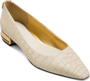 A low, gilded heel brings lustrous contrast to this croc-embossed pump fronted with a snip toe and branded with glinting monogram hardware.