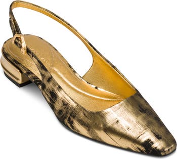 A snip toe furthers the streamlined profile of a metallic slingback pump featuring a low, sculptural block heel for walkable height.