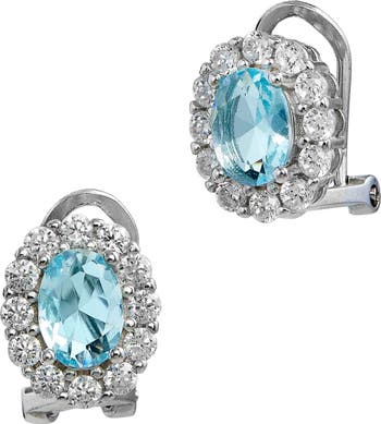 - Rhodium plated prong set faceted oval simulated emerald with clear simulated diamond halo stud earrings