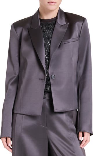 The shiny luster of wool-kissed satin and boxy, cropped tailoring instantly elevate this blazer from a 9-to-5 staple to an off-the-clock stunner.