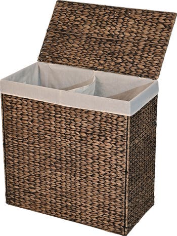 Keep clutter out of sight with our farmhouse-inspired double laundry hamper. This classic storage solution features natural hyacinth fibers woven onto a sturdy metal frame, and an attached lid. The fabric liner is divided into two sections for easy sorting.
