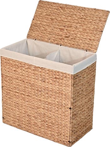 Keep clutter out of sight with our farmhouse-inspired double laundry hamper. This classic storage solution features natural hyacinth fibers woven onto a sturdy metal frame, and an attached lid. The fabric liner is divided into two sections for easy sorting.