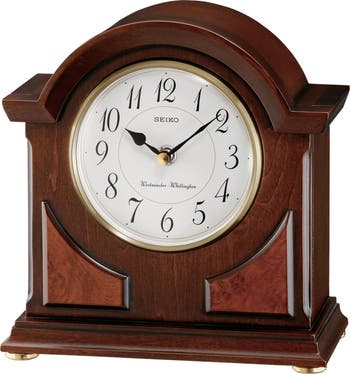 Intricately designed, the Seiko Sayo features a handsome brown wooden case, and white dial behind a glass cover. It features a Westminster/Whittington quarter-hour chime and hourly strikes. So you can sleep well, it also offers a nighttime chime silencer. Volume control allows you to adjust to just the right level. Golden colored ornate accents adorn the front of this clock. Powered by 1 AA battery (included). Overall dimensions: 8.5 X 8 X 3.75 inches. Perfect gift or addition to your decor.
