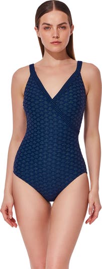 Like the gentle shimmer of moonlight on ocean waves, the Scaled Up Surplice Knit One Piece exudes elegance and subtle allure. Crafted from shimmering fish-scale textured knit fabric, it features a flattering surplice neckline, built-in soft cups, and tummy control for a smooth, confident fit.
