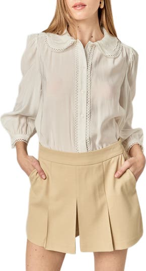 Lacy edges and prim collar embellished with embroidery add infinite charm to a boxy button-up fixed with abbreviated sleeves.