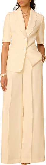 Blazer in a single breasted silhouette featuring scallop trim lapels, short sleeves with button fastenings through the front.