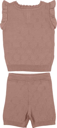 A honeycomb pattern sweetens this cozy yet breathable cotton sweater set that pairs a flutter-sleeve top with matching shorts.