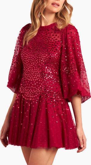 A glittering party mini, the fitted bodice and airy pleated skirt catch every light, billowy sleeves add romance, perfect for evenings that demand show-stopping glamour.