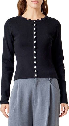 Scalloped detailing highlights the round neckline and contrasting buttons of a long-sleeve cardigan that's a fresh take on a classic layering style.
