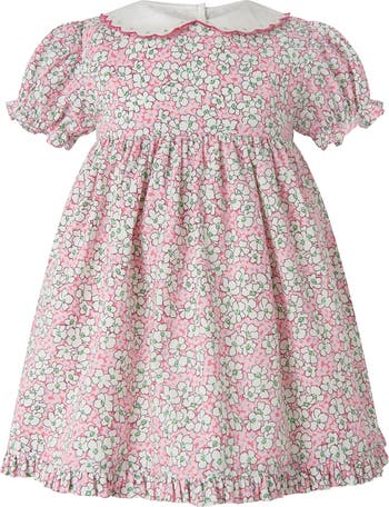 Experience a summer of fun and style with our Scalloped Collar Floral Dress. This adorable dress features a cute floral print in pink and green. The ivory peter pan collar with pink scalloped edging, decorated with green dots, adds a touch of charm. The elasticated short puff sleeves and frilled bottom hem provide a comfortable fit and a playful look. Plus, the matching bloomers offer protection and complete the look!