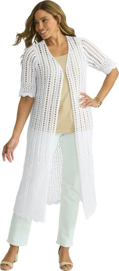 Perfect for your off-duty style, this crochet sweater duster features an open front for a comfortable, relaxed fit. The elbow length sleeves have a scalloped hem for a feminine look that is always on-trend.