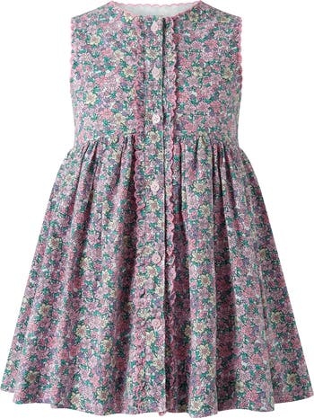 Delicate, detailed, and beautifully timeless, the Scalloped Floral Button-Front Dress captures the charm of a traditional English garden in full bloom. Featuring a finely scattered floral print in soft pinks, lilacs, and fresh greens, this piece feels both nostalgic and refined—perfect for the little girl with a love for classic style.