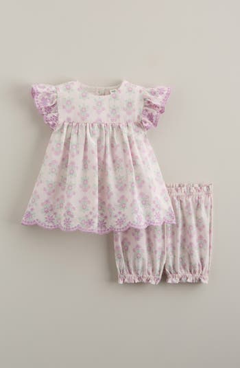 Embroidered eyelets and scalloped edges are adorable in a gingham-check cotton set pairing an A-line top with bubbly bloomers for a picnic-perfect look.