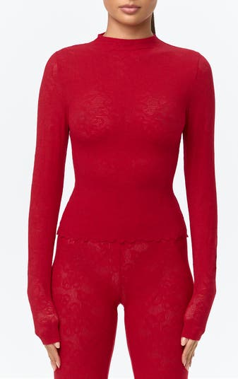Posies proliferate on a stretch lace top that hugs every curve and features a charming scalloped hem.