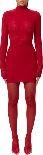 Embrace your curves in this body-skimming minidress that's slightly sheer and made of stretch-enhanced lace that sculpts your silhouette.