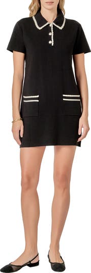 Gleaming buttons and scalloped contrast trim refine this polo-style minidress designed for leg-lengthening appeal.