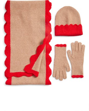 Wrap yourself up for the cold-weather season in this warm set of a scarf, beanie and gloves that are ribbed a comfortable fit and scalloped for a touch of charm.