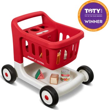 - Lights and sounds activate with every scan to spark imagination Built-in shape sorter encourages critical thinking and fine motor skills Doubles as a stable toddler walker for first steps Grows with your little shopper thanks to three adjustable height settings Encourages pretend play shopping cart adventures from the kitchen produce aisle to the couch checkout station 6 play food items included 3 AAA batteries required - batteries included For little shoppers ages 1+ years