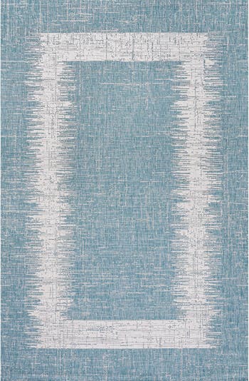 A simple ivory border is woven with a strie' effect on this seafoam aqua geometric rug. This versatile rug's minimalist look is perfect for a coastal cottage or modern outdoor patio. The solid, plain design is a family-friendly solution for a Scandinavian style living room, modern bedroom, kitchen hallway, entry or kids bedroom. The pet-friendly and kid-proof flatweave design makes it easy to clean, and perfect for the beach house.