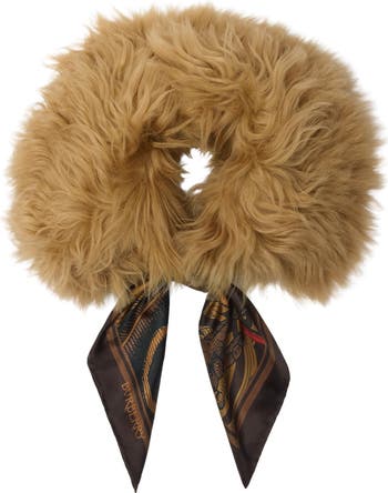 A collar made in Italy from soft shearling. The padded design is trimmed with a silk twill scarf, printed with artwork depicting elements from our Equestrian Knight Design. Hand-drawn in the style of antique etchings, the Knight's armour features alongside the B shield and flag. ||Self-tie closure