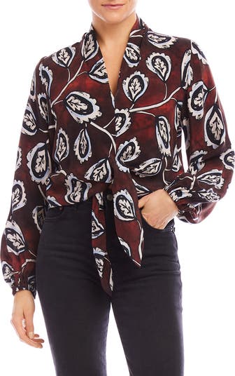 An artistic print stamps a lightweight popover top framed by gently puffed balloon sleeves and a trendy tie waist.