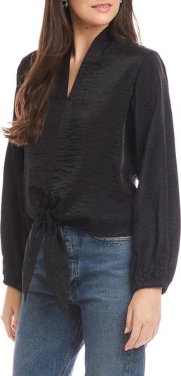 Delightful puff shoulders sweeten the silhouette of this blousy V-neck top made with a hint of shimmer and a drapey tie hem.