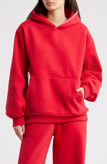 Happy looks good on you, especially when you’re wrapped in this roomy cotton-blend hoodie. The bold whipstitch trim at the lined hood and kangaroo pocket brings sporty polish, and the high-contrast heart graphic finishes it with a cheerful pop.