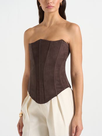 Designed in soft suede for a refined look, this piece combines structure with contemporary detailing. The sculpted silhouette is supported by internal corset boning, enhancing the shape and providing a secure fit. Adjustable lace-up detailing at the back allows for a customised finish, while detachable straps offer versatile styling options.