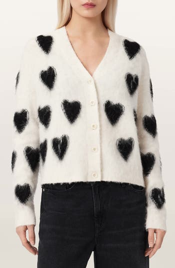Enriched with alpaca for a fuzzy look and feel, this raglan sleeve cardigan is sprinkled with hearts visible from every angle.