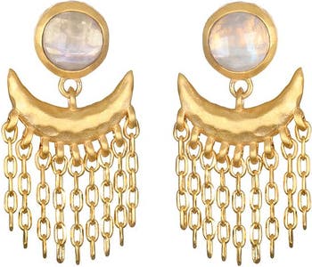 The goddess moon calls us to listen to our innate wisdom, awakening our intuition and igniting our power. 18kt gold plated earrings feature moonstone—stone of feminine energy, hope, and wisdom—anchoring crescent moons, symbol of the goddess, nourishment, and protection. Delicate golden chains cascade from the moons like a scattering of stardust. Wear these earrings to inspire creative thought, and to tap into your divine knowing,