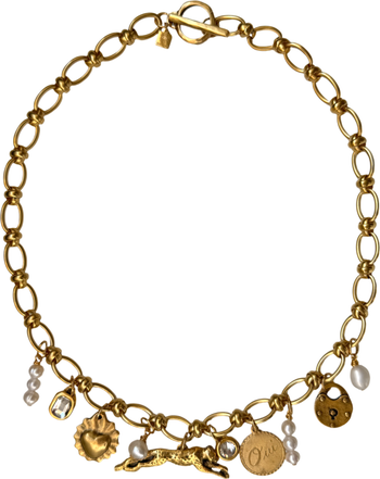 The perfect pair to the Lola bracelet! 18.5” of 12k antiqued gold plated brass knotted oval link chain. It sports an array of charms: a hand-carved leopard, freshwater pearls, crystals, heart, “oui” charm, and a lock as well as a mini toggle clasp.