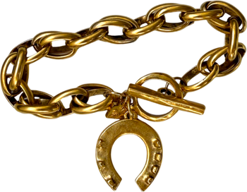 The perfect pair to everyone’s favorite Lucky Earrings! This bracelet is 7.5” of 12k antiqued gold plated brass multi-ring chain, 12k antiqued gold plated pewter horseshoe charm, and a 12k antiqued gold plated toggle clasp.