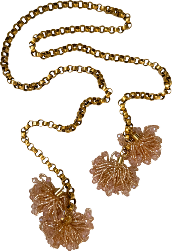 She is glitz, she is glamour! A sparkly dream! Nellie is 36” of 12k antiqued gold plated brass rolo chain adorned with pink beaded tassels. You can wear it long, doubled up, tied in a knot, or as a belt!