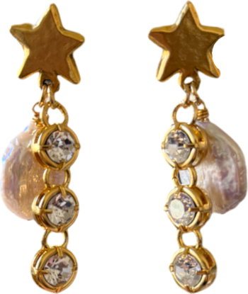Named after my dog Ziggy <3 These earrings are hand-carved 12k antiqued gold plated pewter star studs with stainless steel posts adorned with crystal chain and freshwater coin pearls. These are elegant, yet so funky!